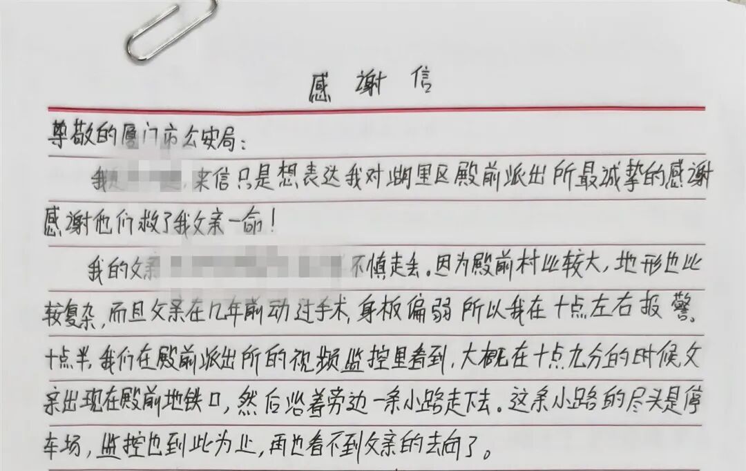 “谢天谢地,父亲没有辜负大家的辛苦付出,他还活着!”一封饱含深情的感谢信送到了湖里公安分局殿前派出所,字里行间满是对派出所民辅警的感激,也为这场惊心动魄的救援故事添上了温暖的一笔。