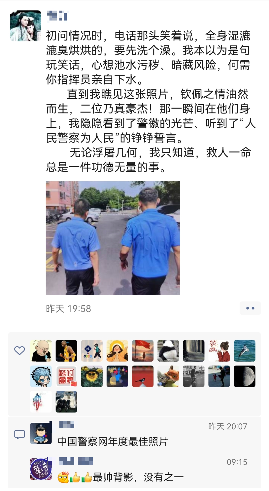 参与救援的民辅警们不顾自身安危,在恶劣环境中全力救援,很多人浑身湿透,衣物和鞋子都报废了。王华祥、赵玺两位湿透的民警背影被记录下来,现场所有救援警力都顶着压力与时间赛跑,每个人都汗透警服。