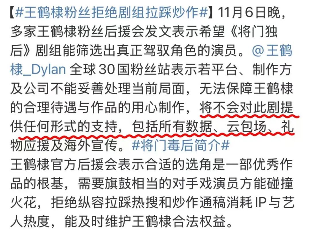 例如,《将门独后》事件中,王鹤棣粉丝向腾讯视频放话:“如果女主是孟子义,这部剧的云包场我们一分钱不花。”