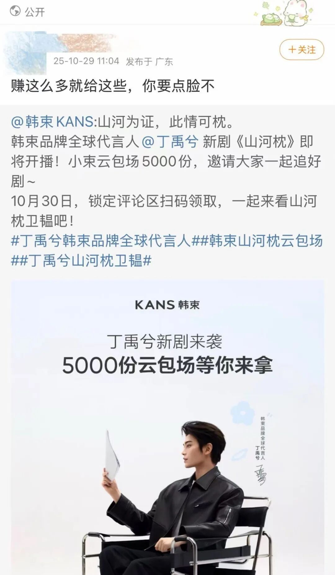 比如,《山河枕》未开播,主演丁禹兮的粉丝就喊话韩束(丁禹兮代言品牌)让其“表示一下”,韩束品牌官微评论区一度被丁禹兮粉丝淹没:“连自家代言人都不包场吗?”