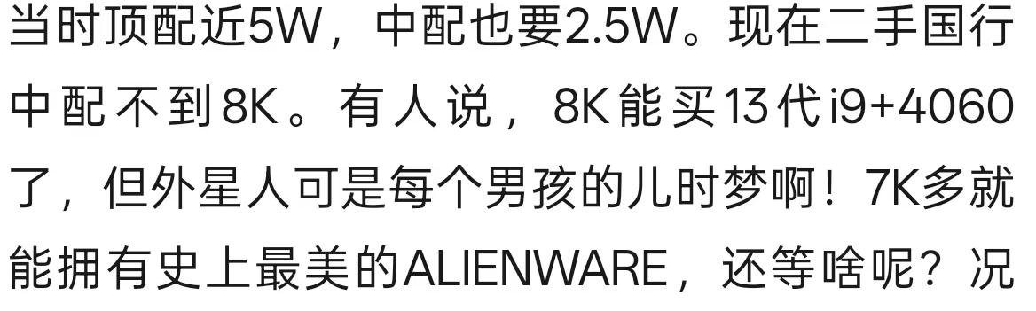 就拿我看到的某篇文章来说,作者反复认真推荐一台数年前的外星人旗舰游戏本,标题直接用“当年32999元的旗舰,现在只要3299”这样的噱头吸引小白。