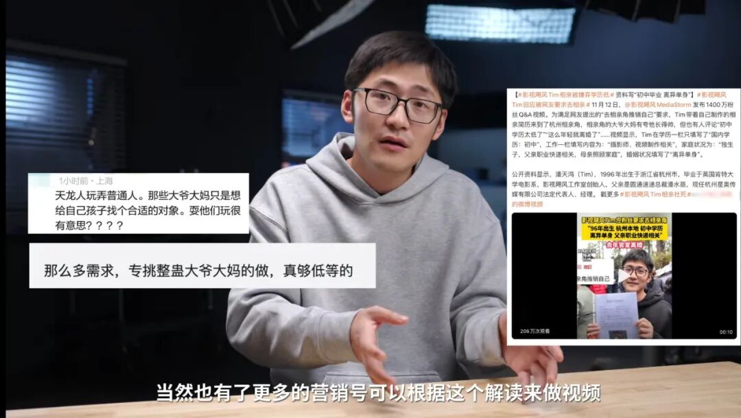 在Tim看来,这次相亲角事件或许就是一个莫名其妙发生的事情。其实一直以来Tim的形象与 “博眼球” 无关,而是敢于揭露行业潜规则的硬核创作者。就在相亲视频发布前不久,团队拍摄了《废弃的电子产品去哪了?》聚焦电子垃圾灰色产业链。2024年10月,发布科普视频《清晰度不如 4 年前!》,大胆揭露各大视频平台为降本增效,偷偷降低视频码率行业潜规则。