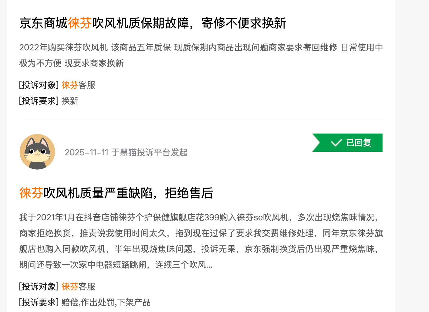 在黑猫投诉平台上,关于徕芬的投诉已超1400条。