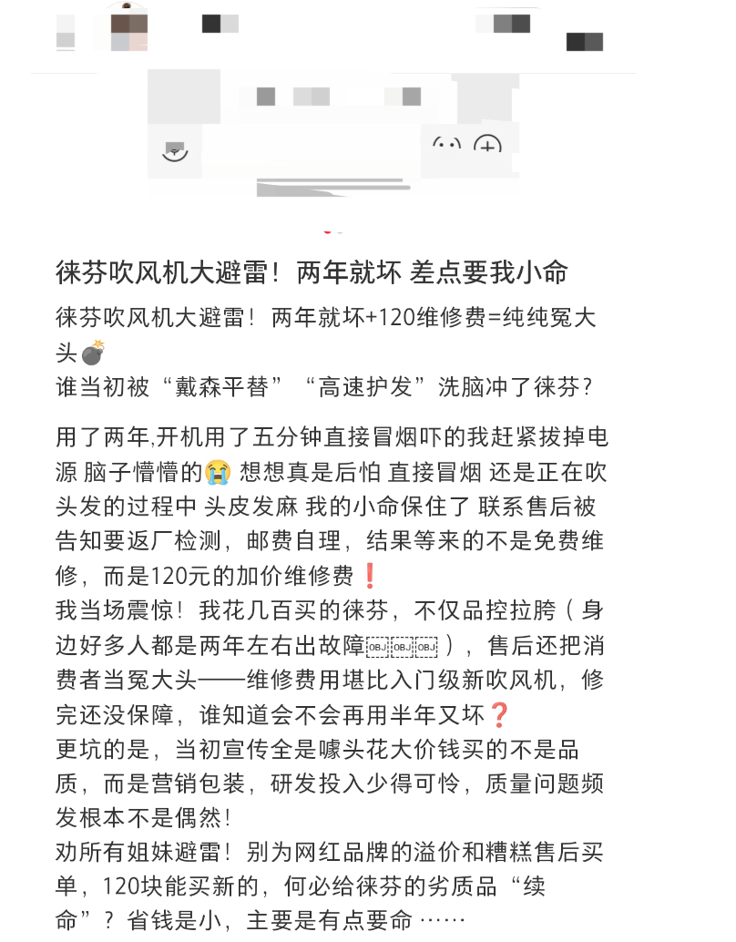 “我花几百块买的徕芬,用两年就坏,修一下要120元,这和买个新的入门款差不多,感觉自己像个冤大头。劝大家别买,别为网红品牌的高价和糟糕售后买单。省钱是小事,安全才是大事。”尹夏对此十分震惊和不解。