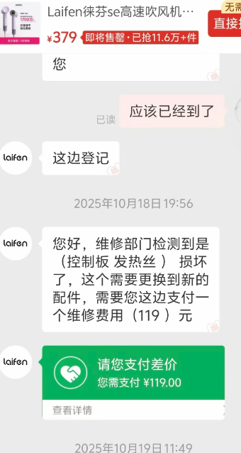 然而,售后处理让他更加心寒。尹夏联系徕芬官方售后,对方要求他将吹风机返厂检测,但等待他的不是免费维修,而是一张近120元的维修报价单。