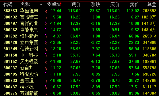 近日强势的锂电概念盘中大幅跳水,截至收盘,华盛锂电跌超17%,海科新源等跌超14%,信德新材、中一科技、天力锂能等跌超10%,石大胜华、天际股份、天赐材料、多氟多等跌停。