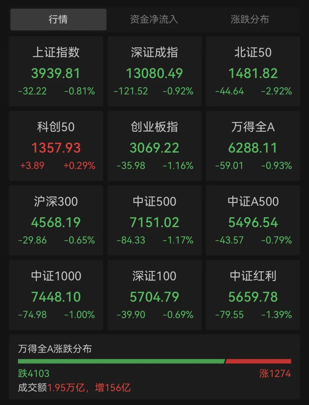 具体来看A股市场,三大股指盘中震荡下探,午后加速下行,创业板指跌超1%。截至收盘,沪指跌0.81%,报3939.81点;深证成指跌0.92%,报13080.49点;创业板指跌1.16%,报3069.22点;北证50指数大跌近3%,科创50指数逆市涨0.29%,沪深北三市合计成交19461亿元,成交额和前一日大致相当。