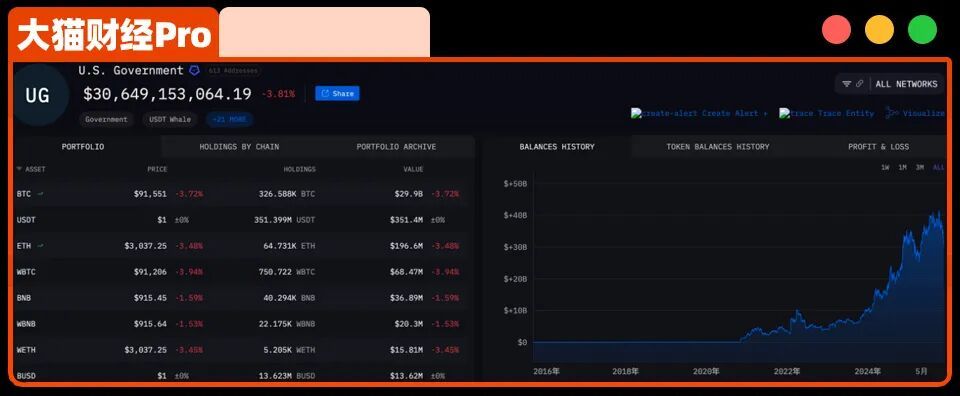 加密资产的安全神话被打破,美国“国家级黑客”可以任意盗窃大笔数额加密资产。从一个被认证为“美国政府”的钱包来看,2021年前只有零星资产,2021年后资产开始暴增,最近两年持币量和市值均达高峰,目前该钱包里有306.5亿美元资产,约2200亿人民币,其中比特币市值最高,占到资产总额的96%,被黑的这12.7万枚比特币大约占到比特币资产的40%,真可谓是“陈志跌倒,美国吃饱”。
