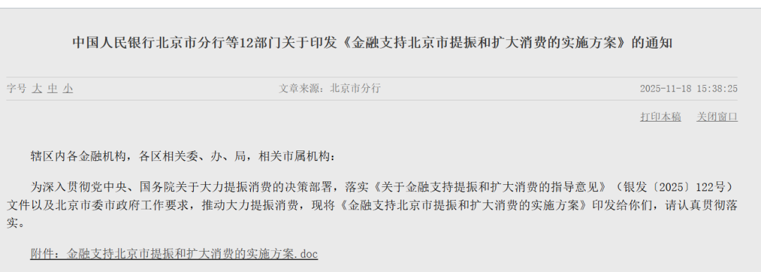 11月18日,中国人民银行北京市分行等12部门联合印发了《金融支持北京市提振和扩大消费的实施方案》。