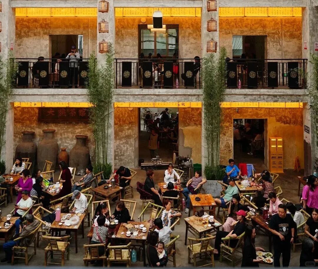 事实上,大部分老茶馆都是以老建筑为载体,融入方志文化与市井元素。例如,成都大旗茶馆保留了原漆器工艺厂的建筑格局,仅以牌匾、书画、漆器点缀,搭配竹桌竹椅与盖碗茶,还原老成都市井风貌,还不定时推出川剧变脸、非遗功夫茶等表演。