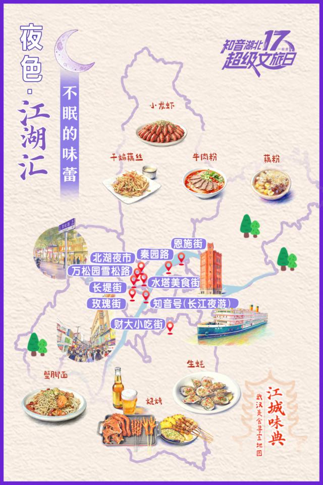 第四张:夜色·江湖汇:这是不眠味蕾的狂欢时刻。夜幕降临,万松园等夜市热闹非凡!夏天小龙虾有油焖、蒜香等多种口味,秋冬时节香辣蟹成为主角;天气转凉时,钻进火锅店,红汤麻香四溢,白汤醇厚浓郁,毛肚在锅中“七上八下”后裹满香油,暖意瞬间驱散寒意。夜色中的武汉,夜市摊的烟火与火锅店的暖意相互交织,每一口热食都饱含着鲜活的人间温情,让人留恋不舍。