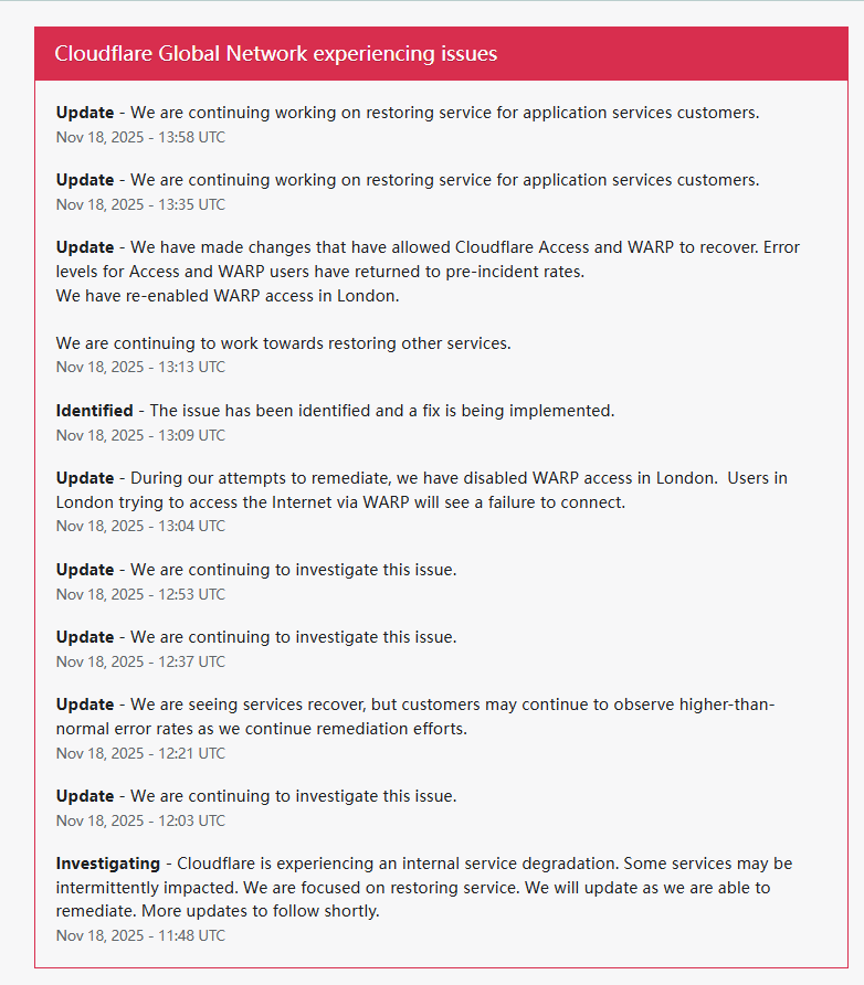 11月18日,知名网络基础设施公司Cloudflare称其全球网络出现问题,致使许多网站和应用程序服务中断,像X(原twitter)、ChatGPT等多家互联网平台无法访问。据媒体报道,Spotify和亚马逊也出现了服务中断情况。