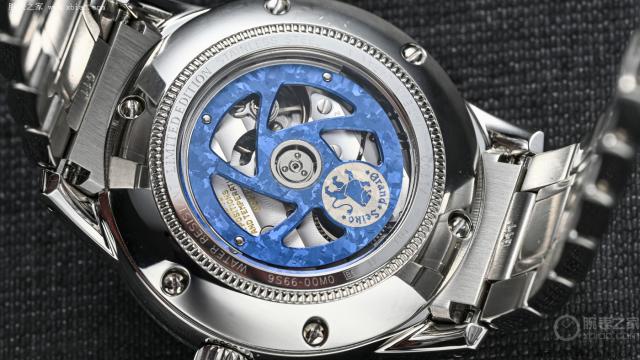 透过蓝宝石水晶表镜,可以看到特别的自动陀,由阳极氧化铝打造出独特花纹,呈现品牌经典的 Grand Seiko Blue 色调,观赏性佳。自动盘上还饰有冠蓝狮的品牌名称和标志性的狮子图案。