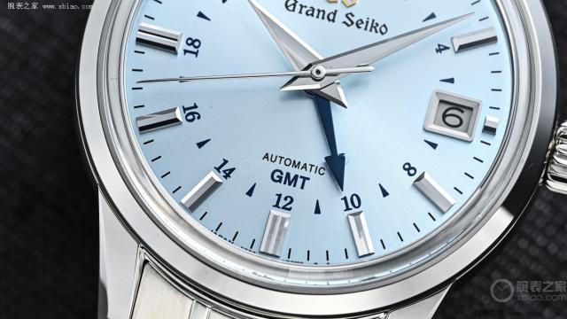 表盘三时位置设有日历窗,银色的时标和箭形指针与蓝色表盘搭配简洁。时标内圈的深蓝色数字用于 GMT 两地时的 24 小时显示。两地时指针采用蓝钢打造,与浅蓝色表盘形成对比,能快速读取第二时区时间。