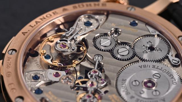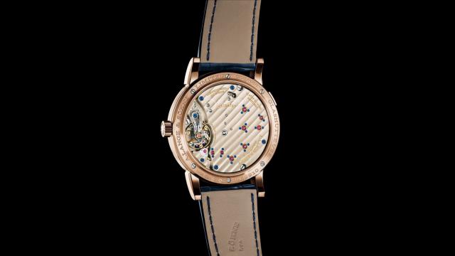 通过背透可见内部搭载的 L043.6 机芯,由 451 个零件组成,组装耗时久。机芯振频每小时 18000 次,动力储存 72 小时,公价 81 万多。