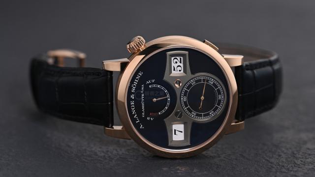 ZEITWERK 是朗格特色系列,摒弃传统指针,采用数字“跳字”显示时间,精准且有仪式感。表盘上方是动力储存显示,下方是小秒盘,左右分别显示小时和分钟。