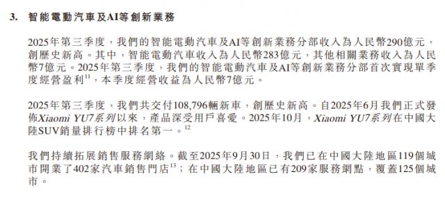 值得一提的是,包括智能电动汽车和 AI 在内的创新业务收入高达 290 亿元,同比增长近两倍。其中,小米汽车业务收入达 283 亿元,本季度首次实现盈利,单季经营收益达 7 亿元。
