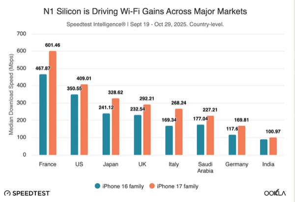 此次研究采用了 2025 年 9 月 19 日至 10 月 29 日期间全球 Speedtest 用户的众包数据,涵盖了美国、法国、意大利、英国、印度、日本等多个国家。结果显示,无论在哪个地区,搭载 N1 芯片的新机都展现出更快且更稳定的 Wi-Fi 连接能力。Ookla 特别提到,N1 芯片的作用更多是“抬高了性能下限”,而非单纯追求峰值速度,这使得新机在信号较弱或干扰较多的复杂环境中也能保持良好表现。