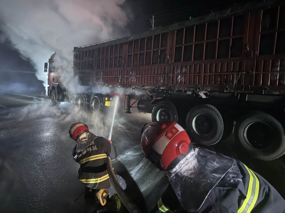 指挥员根据现场情况,迅速制定了灭火方案。利用消防车装备的两支高压水枪展开扑救,一支水枪持续对车厢进行喷射冷却,防止火势向车体蔓延;另一支水枪则集中喷射着火的轮胎,压制并扑灭明火。