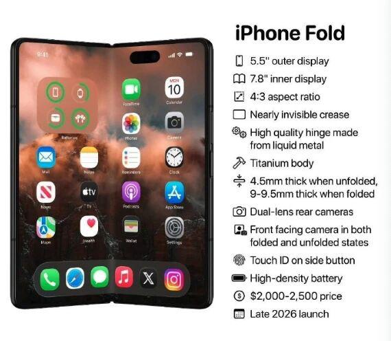 此前有消息称,折叠屏iPhone预计内屏约7.7 - 7.8英寸,外屏约5.5英寸;可能会配备屏下自拍镜头;