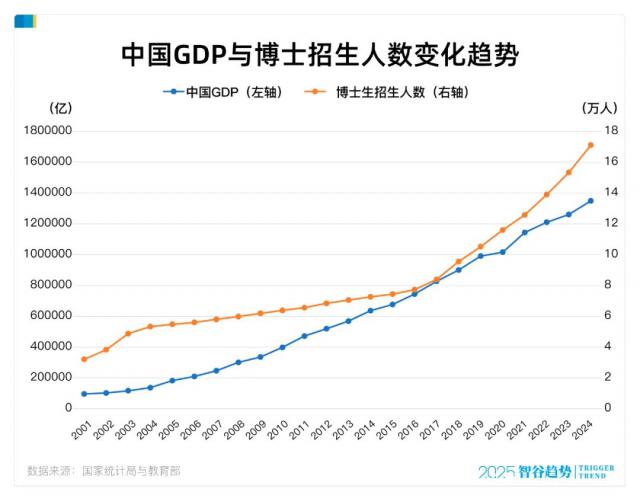 放眼全球,中国已经成为一座规模巨大的“博士工厂”。博士扩招速度比本科、硕士都要快。根据全国教育事业发展统计公报,2024年中国招录了17.11万名博士,同比增长11.6%;而硕士同比增长3.2%;本科生同比增长2.46%。