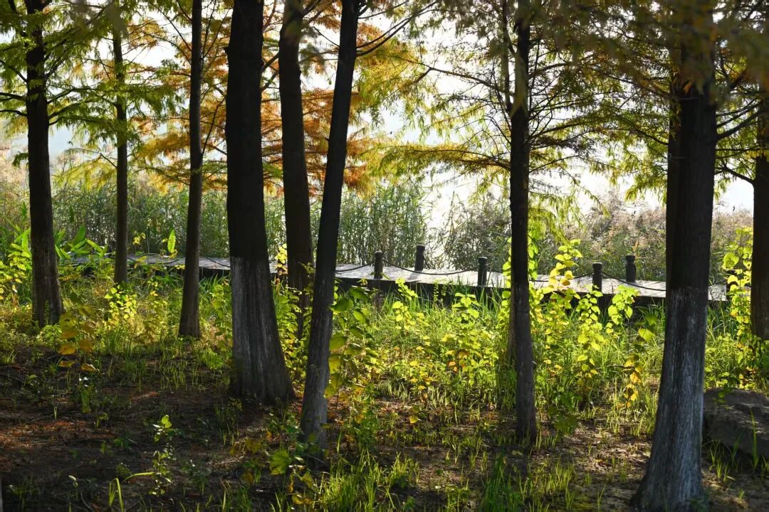 午后阳光穿透枝叶,在地面投下斑驳光影,红杉倒影随波荡漾,活脱脱一幅流动的莫奈油画。