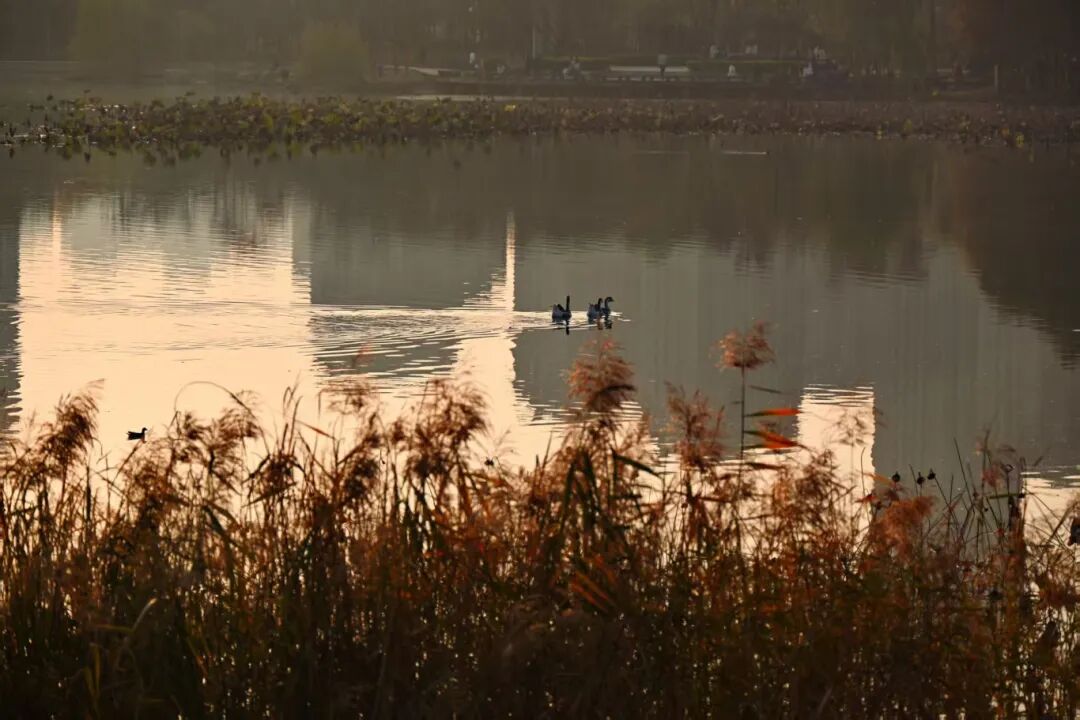水鸟在湖面悠然游弋,为画面增添了几分灵动。
