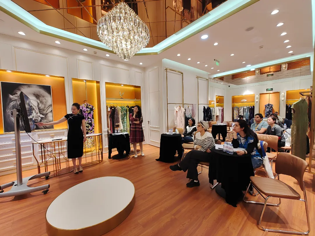 课堂上,蔓楼兰的工作人员介绍说:“制作旗袍需要68道工序,其中8道工序是最重要的。”接着,工作人员以店内展示的旗袍为范本,向外籍人才们详细讲解海派旗袍的历史渊源、工艺特点与文化内涵。从盘扣的传统工艺技法,到不同面料的运用,再到旗袍的搭配技巧,讲解生动有趣。工作人员还邀请外籍人才触摸面料、观察盘扣细节,让大家对旗袍的认知从“视觉欣赏”转变为“触觉感知”。