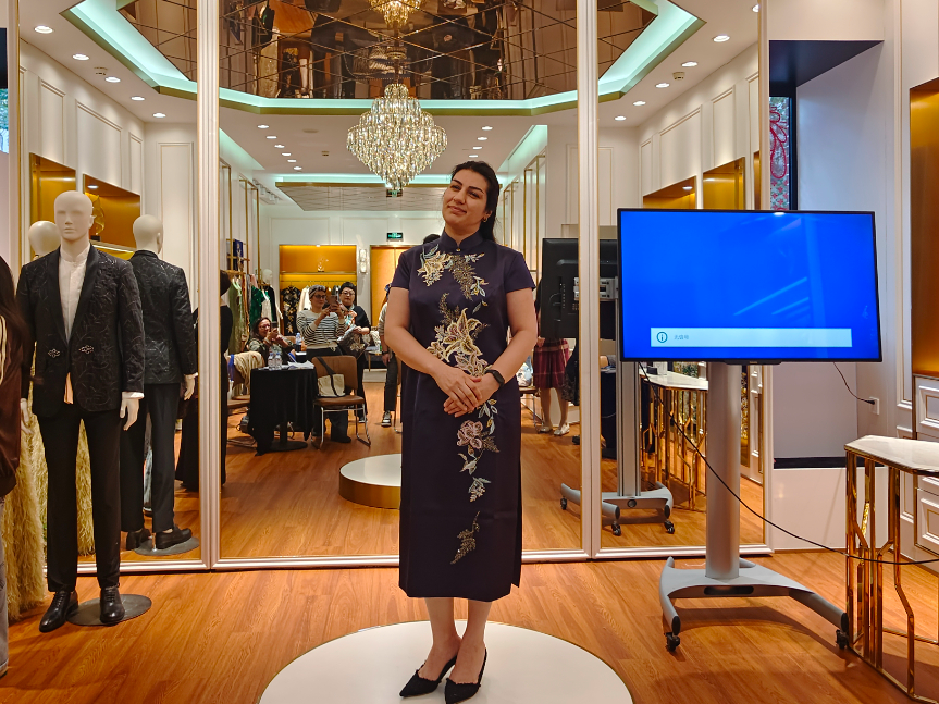 随后,外籍人才们纷纷挑选心仪的旗袍试穿。纱哈耶选了一件藏青色的旗袍,在工作人员的指导下摆起优美的姿势。她感慨道:“旗袍穿起来也很有亲切感,它不仅是一件服饰,更是艺术品!”