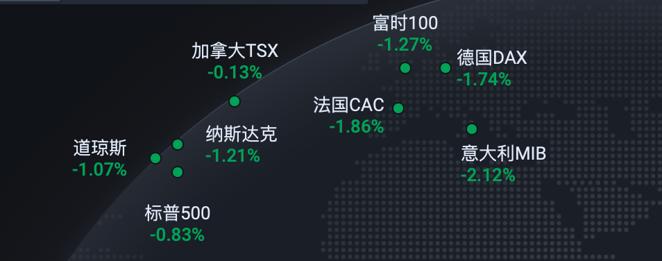 11月18日,欧美股市遭遇全线大跌,已连续4天回调。纳斯达克、道琼斯指数跌幅均超1%,意大利MIB跌超2%,德国DAX、法国CAC跌幅也均超1%。