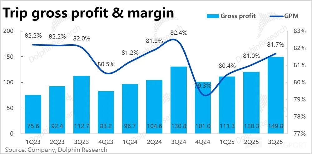 票务收入本季同比增长11.4%,环比继续提速。如海豚上季度所说,随着去年公司减少机票绑定销售导致的低基数期过去,票务业务收入增速将有所修复。此外,本季度出境游需求复苏也对票务业务有较大贡献。