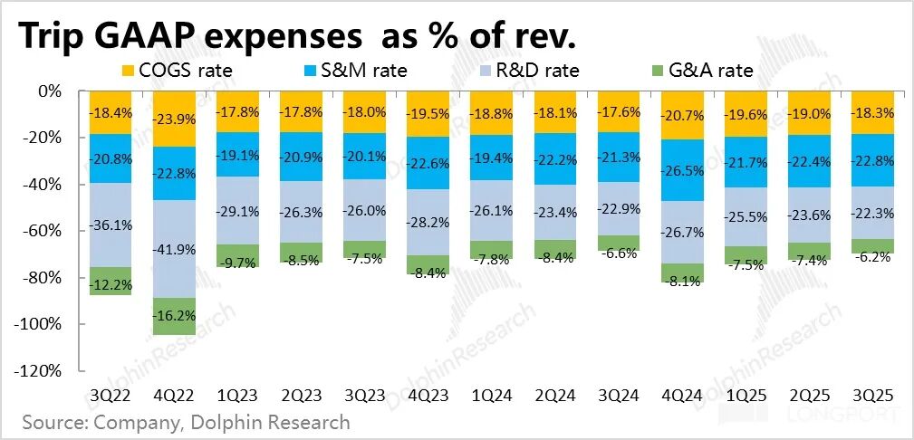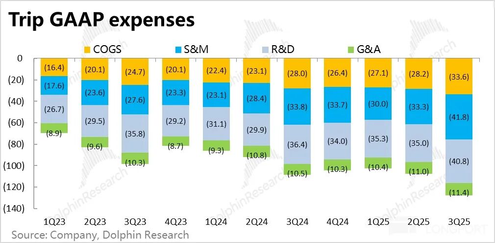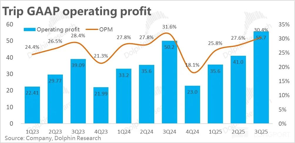 GAAP口径下,由于毛利率收缩,费用支出扩张,本季度携程的GAAP经营利润率同比收窄1.2个百分点,经营利润同比增长11%至55.7亿。