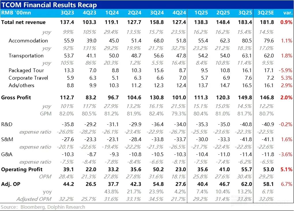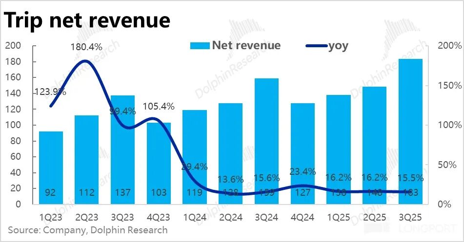 本季度携程集团整体净收入约183亿元(剔除营业税),同比增长15.4%,增速环比略有放缓,但仍略高于市场预期的14.5%,增长态势稳健。