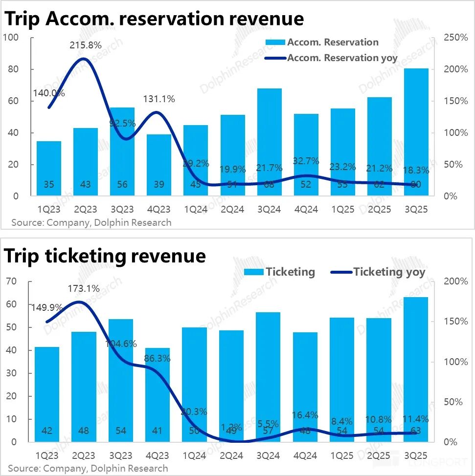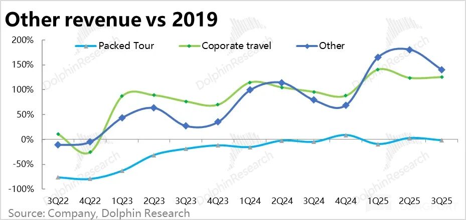 3、两大支柱业务情况:本季度酒店预定营收同比增长约18%,环比继续降速3个百分点,接近公司先前指引区间14% - 19%的上限。除基数升高外,国内外酒店客单价下行也是拖累因素之一。