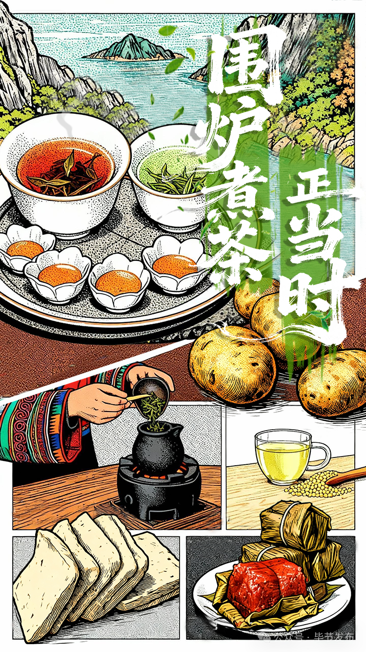 用铁网烤盘,中间摆上一壶茶,茶壶外围摆上威宁洋芋、大方豆干、黔西黄粑……三五好友相聚,围炉煮茶,一边喝茶,一边追剧聊天,十分惬意。