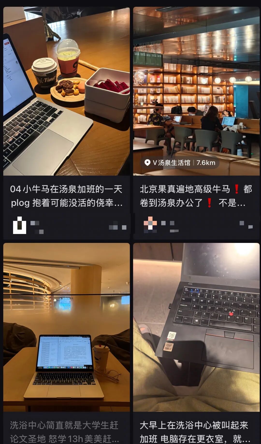 如今的洗浴中心服务范围更广,半熟不熟的搭讪越来越少。休息大厅里,每个躺位都有单独的电视,人们可以随便点播节目,也可以刷手机。一线城市的中高端洗浴还在休息区开辟了工作区,有人会带着笔记本电脑来加班,为打工者打造“洗浴+”场景很有必要。