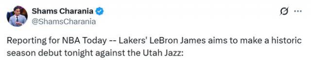 北京时间11月19日,据名记Shams在节目中报道,湖人球星勒布朗 - 詹姆斯预计今日出战犹他爵士队,完成具有历史性意义的赛季首秀。这意味着詹姆斯将正式开启他职业生涯的第23个赛季,成为NBA历史上首位达成这一成就的球员。