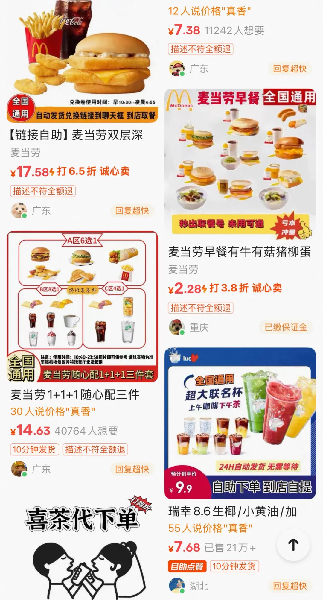 在零工经济火热的当下,“代下单”是低门槛、小成本的副业。“代下单”商家卖麦当劳产品比会员价贵1 - 3元。淘宝上排名前列的麦当劳“代下单”店铺,销量超100万,利润可观。