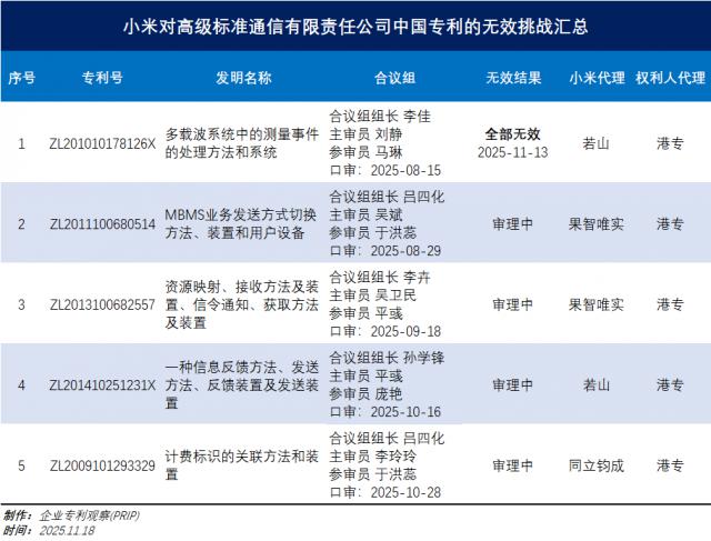 企业专利观察(PRIP)对小米针对高级标准通信中国专利发起无效挑战的记录进行统计,结果显示有五起案件,此次是首次作出无效决定,其余四起案件仍在审理中。