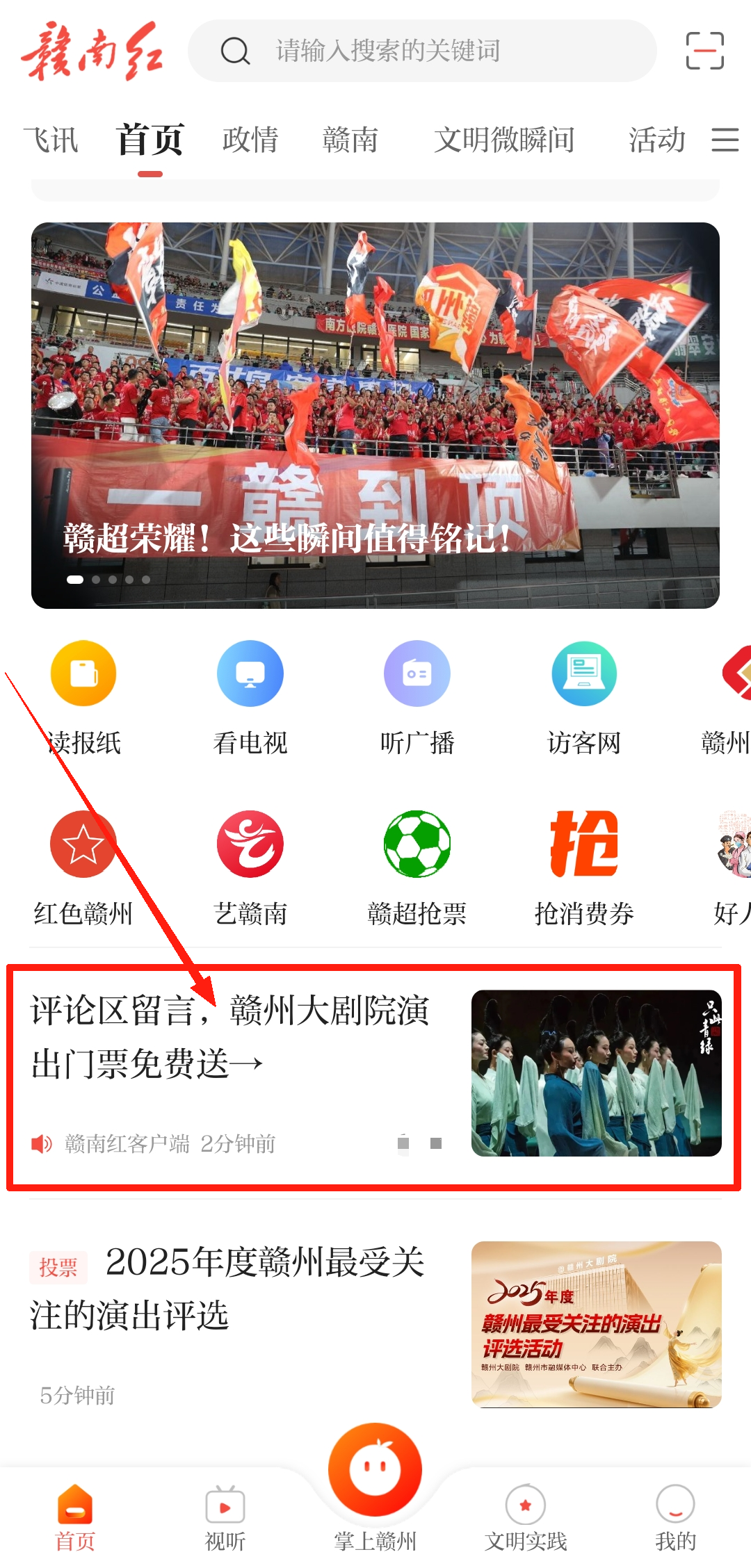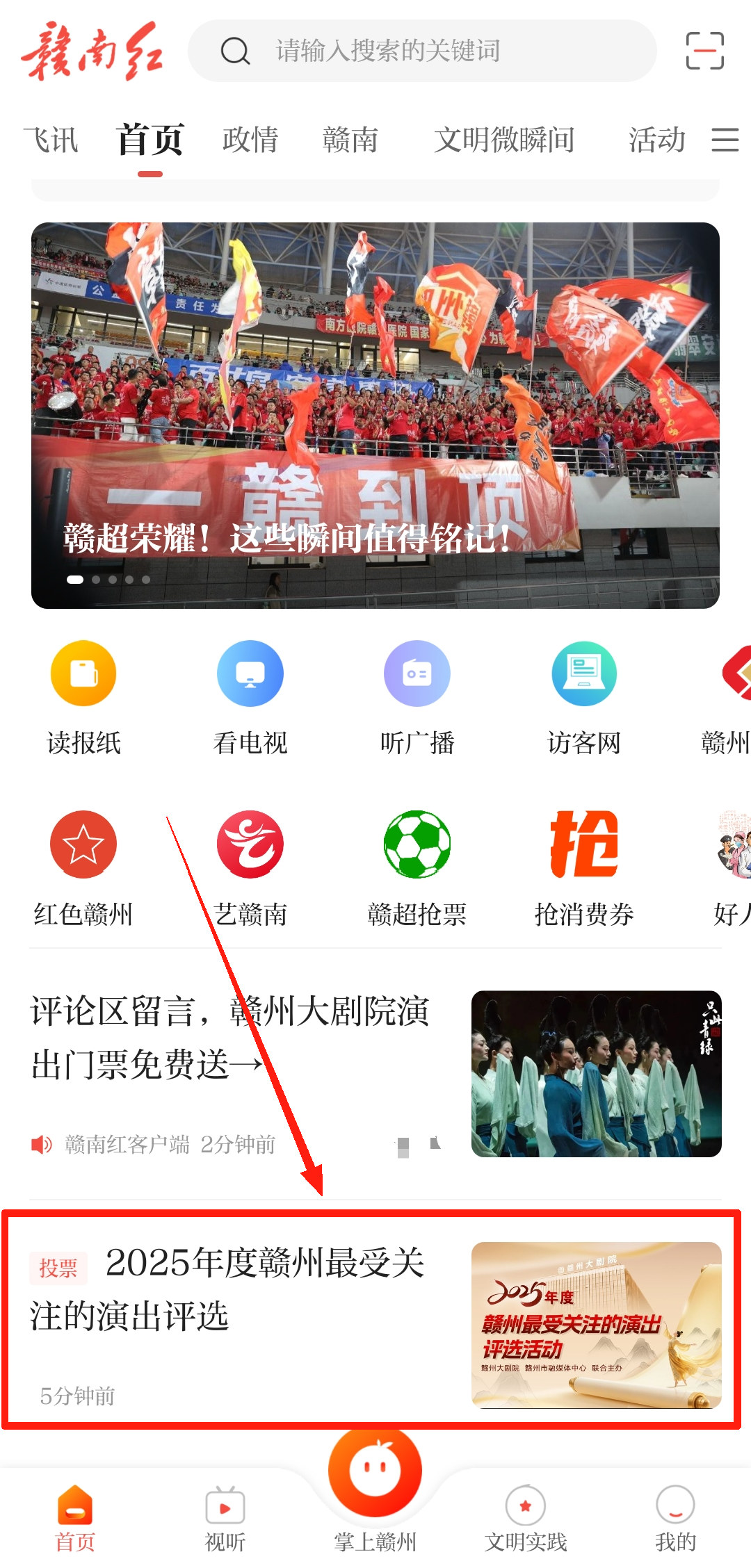 第二步:在赣南红客户端首页“2025年度赣州最受关注的演出”可进入投票专区,为喜爱的演出投票。