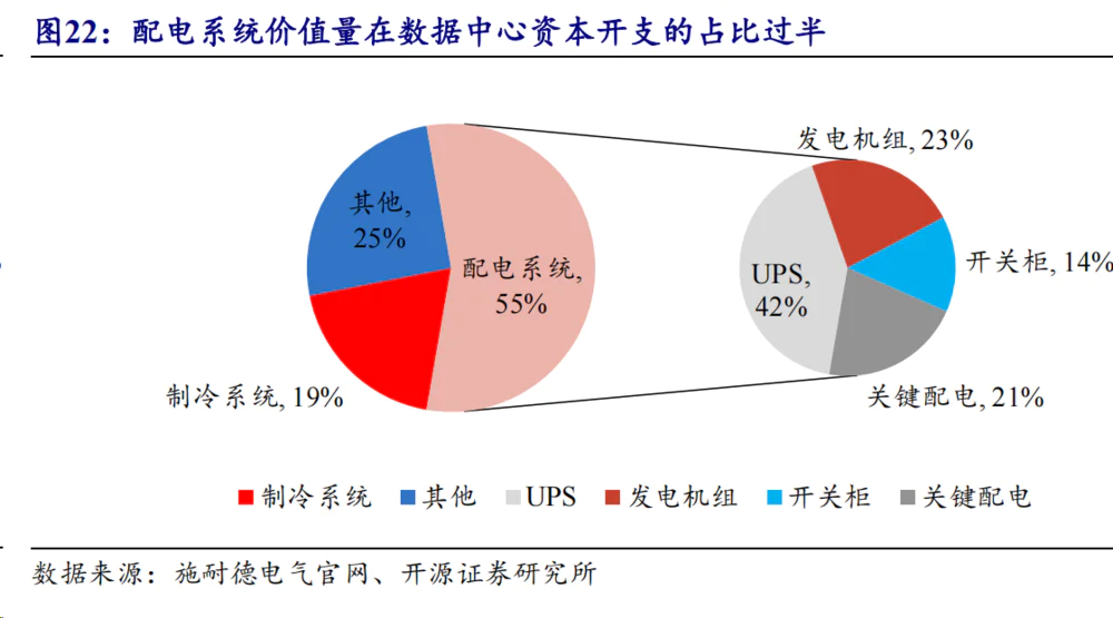 配电系统在数据中心资本支出(Capex)中价值量占比最高。参考施耐德2023年数据中心投资成本计算器,假设一个5MW数据中心,单机柜功率8kW,采用2N配电、2N冗余UPS架构,配电系统价值量在建设成本中的占比为55%,制冷系统价值量占比为19%。在配电系统中,UPS、发电机组、开关柜、关键配电的占比分别为42%、23%、14%、21%。