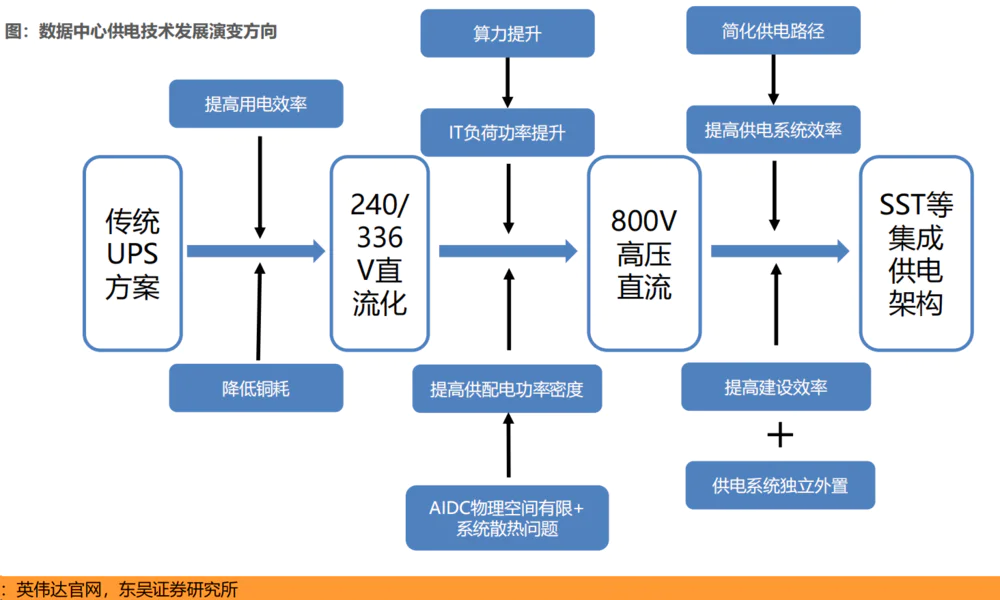 随着AI算力需求的增长和高性能GPU的部署,IT负荷功率大幅提升,同时数据中心物理空间有限,供配电功率密度大幅提升,供电系统正朝着800V/±400V高压直流系统发展。远期来看,大型互联网数据中心(AIDC)向GW级发展,固态变压器(SST)等集成供电架构有望成为主流。