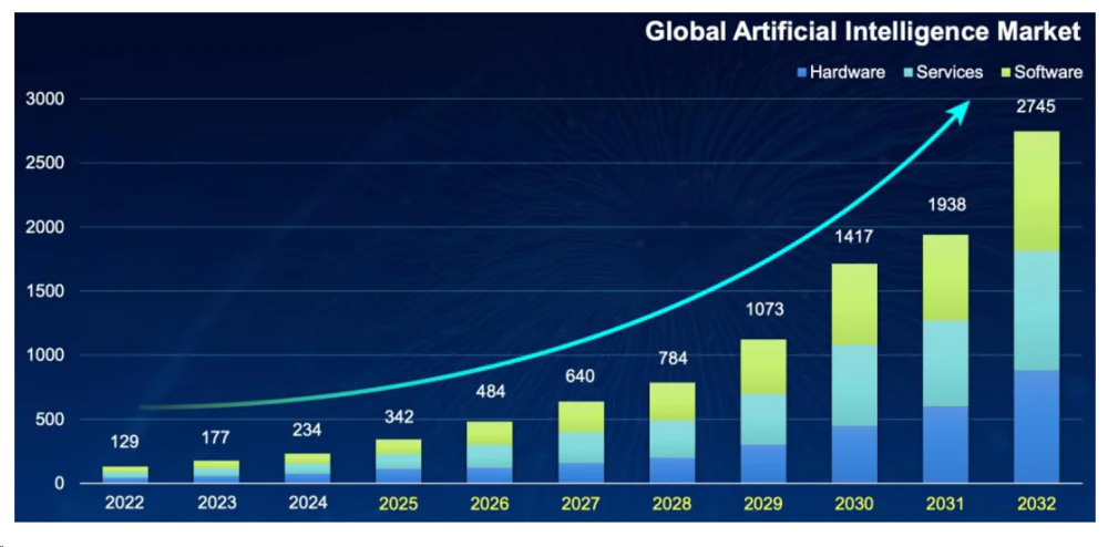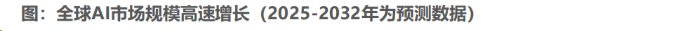 全球AI市场规模正处于高速增长阶段。随着GPT、Deepseek等生成式AI的问世,全球AI事业迎来技术奇点,市场规模也进入快速增长期。据IEA预测,2024年全球AI产业市场空间约234亿美元,到2032年有望达到2745亿美元,复合年增长率(CAGR)高达36%,成为全球不可忽视的增量市场。
