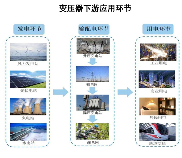变压器在输配电系统各环节中起着重要作用。它是通过电磁感应原理来改变交流电压的装置,是输配电的重要基础设备,包括运行在主干电网的升压变压器和运行在终端的配电变压器两大部分。
