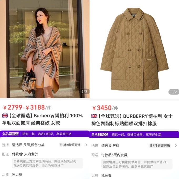 最近,不少消费者发现盒马APP全球购板块上架了Burberry羊毛披肩、棉服等商品。不过现在相关商品已下架,盒马APP全球购板块上暂时看不到Burberry以及其他奢侈品牌的身影。盒马相关人士表示,该板块商品是批次商品,卖完就下架,后续会定期更新,目前大概每季度更新一次。