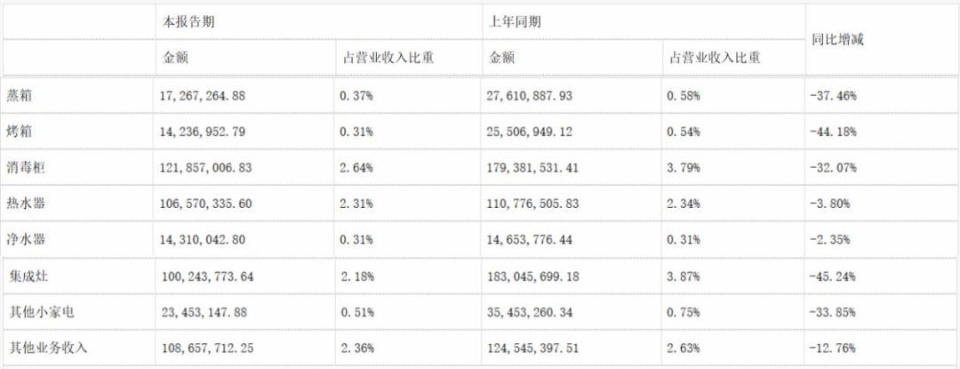 二代任富佳接班后力推的第二、三品类,在2025年上半年业绩不佳。除一体机外,其余品类营收下滑,烤箱与集成灶跌幅超44%。