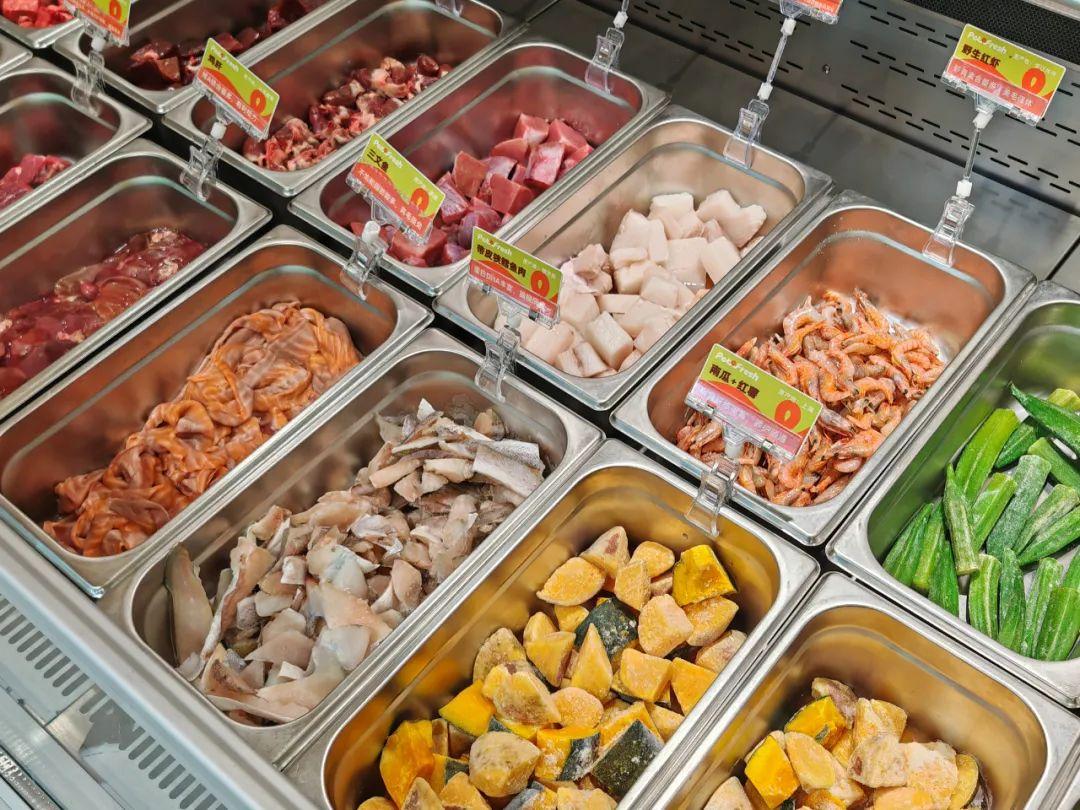 在派特鲜生的首家门店中,除了货架上的罐头、主粮、零食、宠物用品等,最显眼的是两个“鲜食”柜台。一侧提供各类生肉和蔬菜,顾客挑选后,现场熟制成猫狗饭;另一侧是各类制成品,比如有专供宠物食用的沙拉和蛋糕。