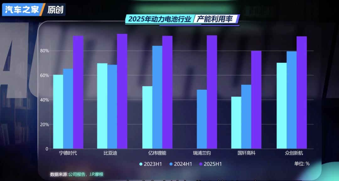 J. P. Morgan的供需模型显示,2025年动力电池行业产能利用率自2022年以来首次整体突破80%。
