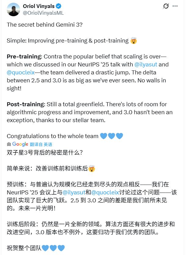Gemini 3发布后,谷歌DeepMind副总裁奥里奥表示,这不是简单的规模扩张,而是围绕预训练、后训练的协同进化,Gemini 2.5与Gemini 3差距巨大,看不到发展天花板。
