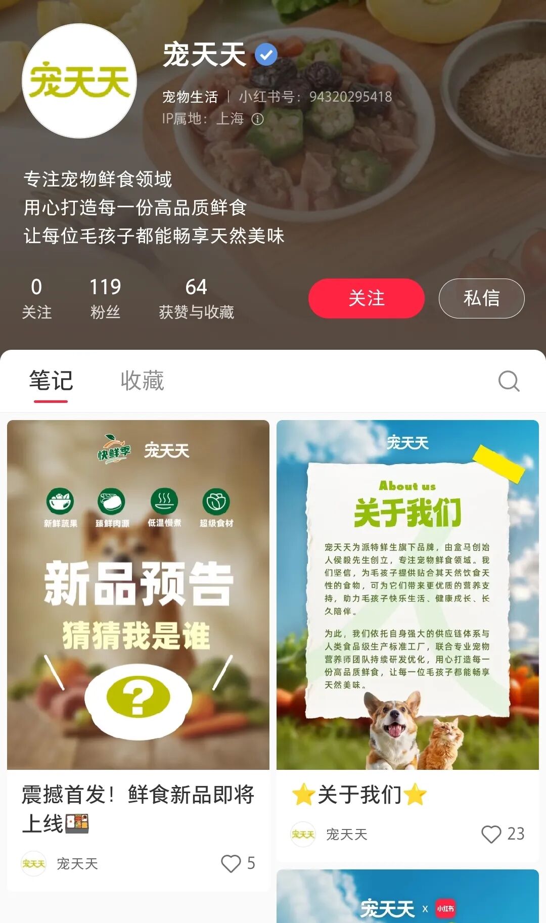 目前,宠天天已入驻小红书开通账号,截至发稿,仅有3条帖子,粉丝数119人,发帖点赞量最高29个。